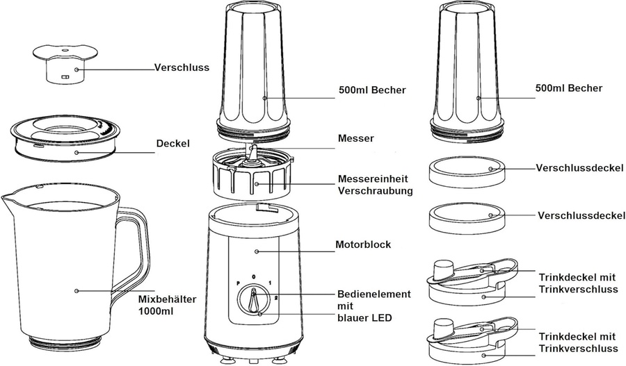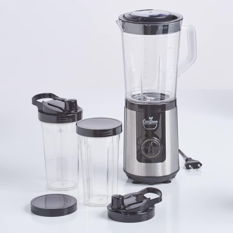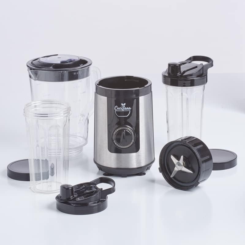 سموذي ميكر CuciSana 400W. سكينة Piranha حادة للفرم والخلط. وعاء 1 لتر و 2 كوباية بغطاء للتنقل (To-Go). خلاط سريع، صغير، وسهل التنظيف للجيم والشغل.