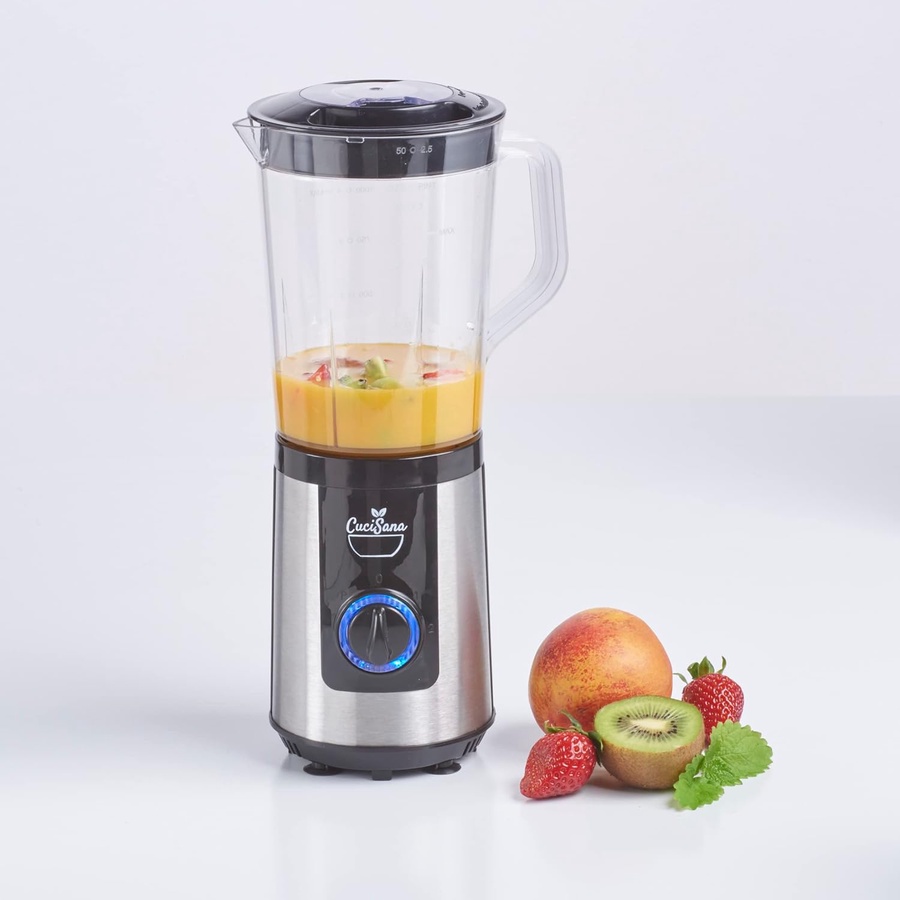 لو بتحب تشرب عصير فريش وأنت رايح الجيم أو الشغل، ومش عايز توسخ مواعين كتير، CuciSana Smoothie Maker هو أنسب حل ليك. الجهاز ده حجمه "كومباكت" جداً، بس قوته 400 واط مع سكينة حامية اسمها "سكينة البيرانا" (Piranha Knife)، يعني بتعض وتفرم الفاكهة والخضار في ثواني.