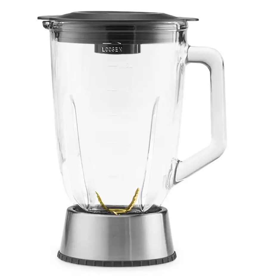 - خلاط زجاجي (Blender): شفشق زجاج سعة 1.5 لتر بيستحمل السخن والبارد. يعني تضرب فيه شوربة سخنة، وتعمل فيه سموذي وتجرش تلج (Ice Crushing) بـ 4 شفرات تيتانيوم قوية جداً.