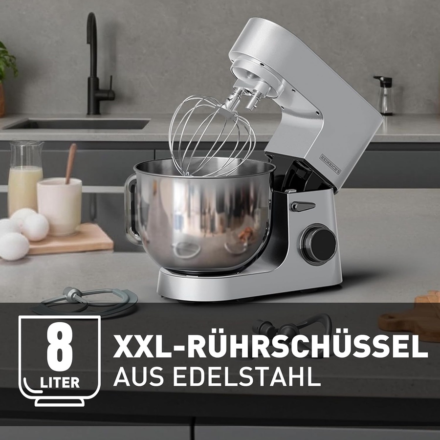 - وعاء XXL: حلة ستانلس ستيل عملاقة بسعة 8 لتر، بتشيل كميات عجين ومكونات تكفي عيلاء كبيرة أو عزومات ضخمة.