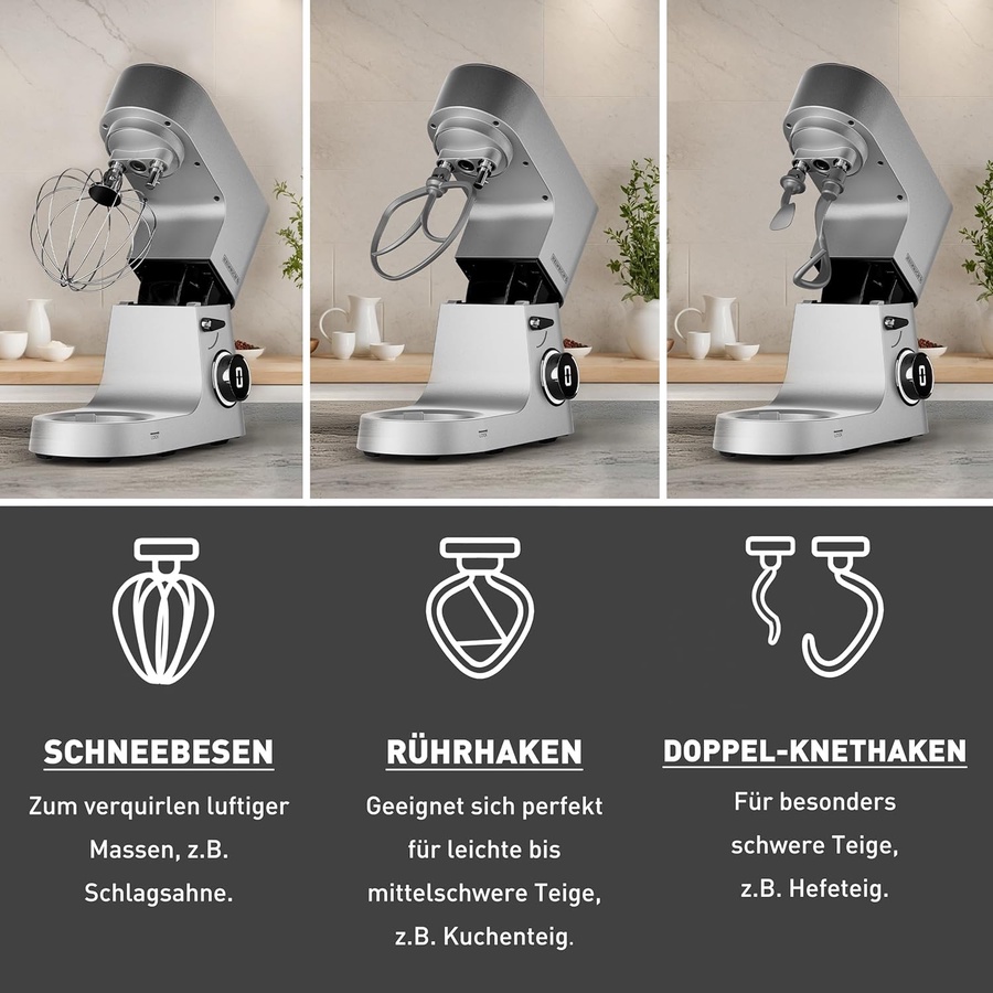 - الملحقات: دبل هوك (عجن مزدوج)، كف بحواف سيليكون، مضرب بيض (كلهم Teflon coated).