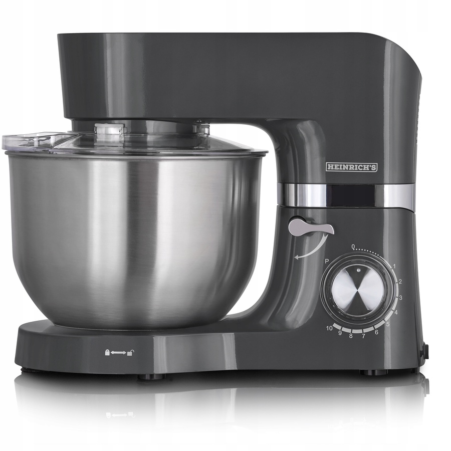 عجانة Heinrich's HKM 6278 رمادية بقوة 1300 واط. وعاء ستانلس ستيل XL سعة 6.2 لتر. 10 سرعات، تشغيل هادئ، ومرفقة بخطافات ومضرب خفق.