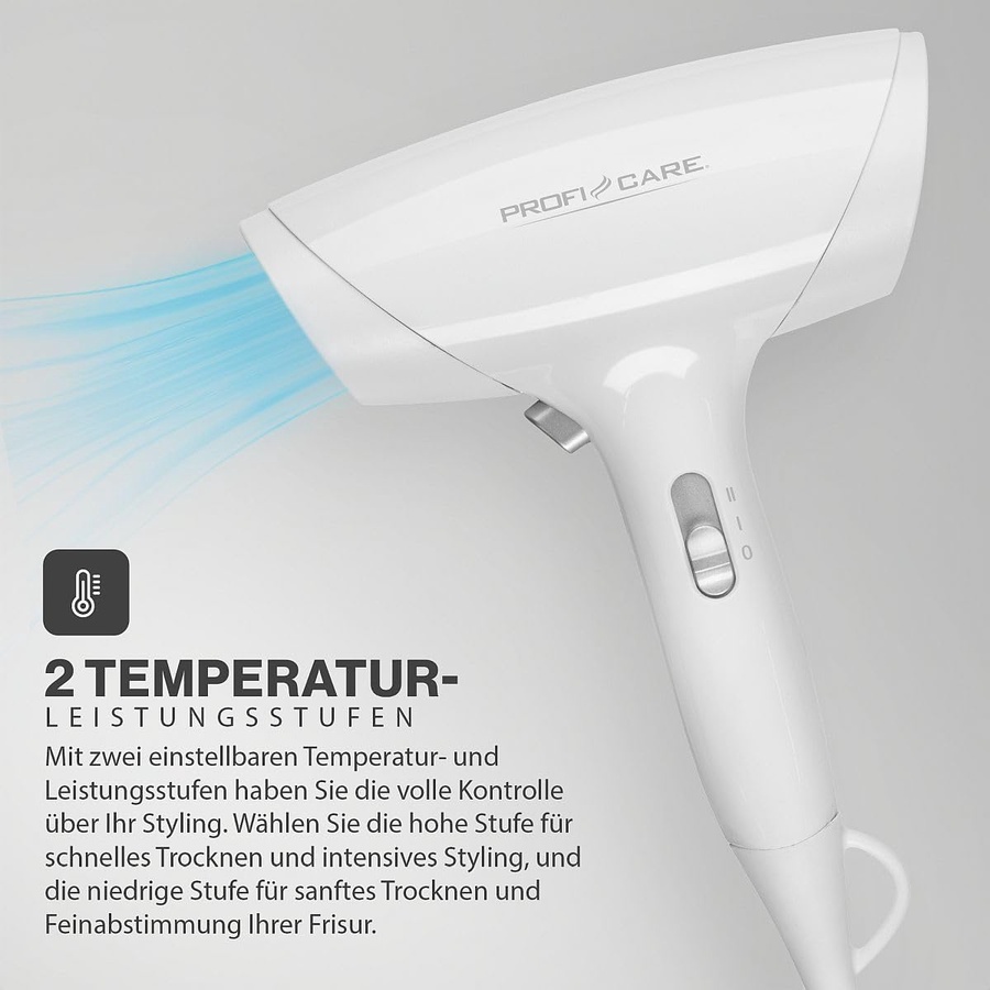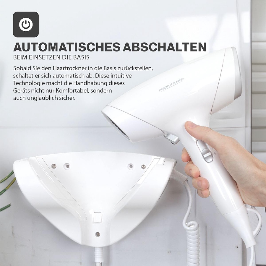 مجفف شعر ProfiCare 1800W مدمج (PC-HT 3044). مستويان للحرارة وCool Shot. حامل جداري مع إغلاق تلقائي وكابل حلزوني طويل لمرونة فائقة.