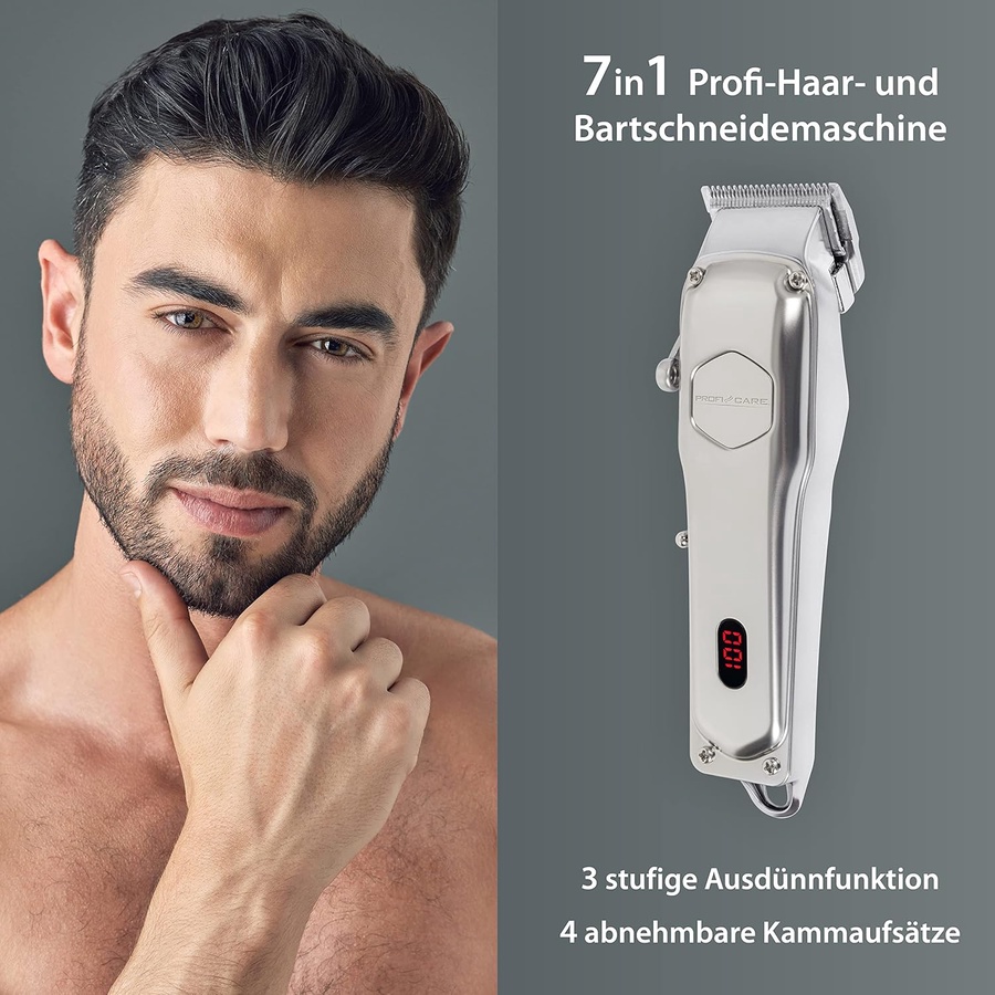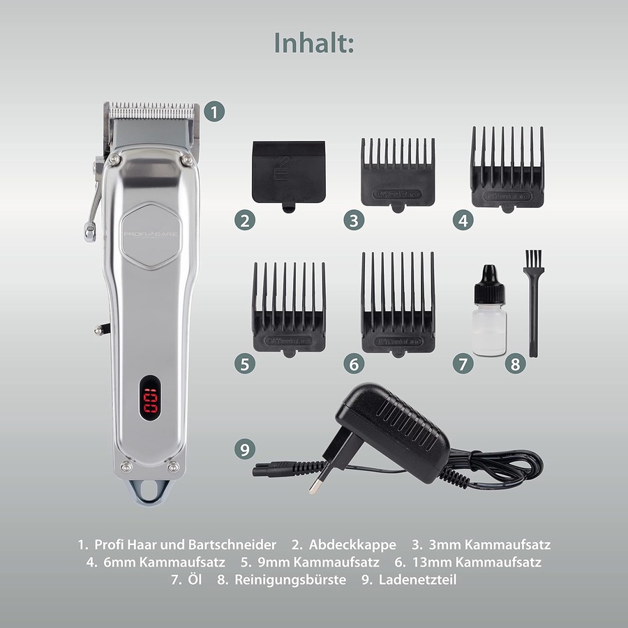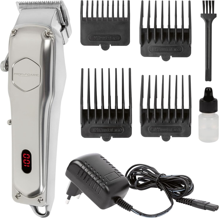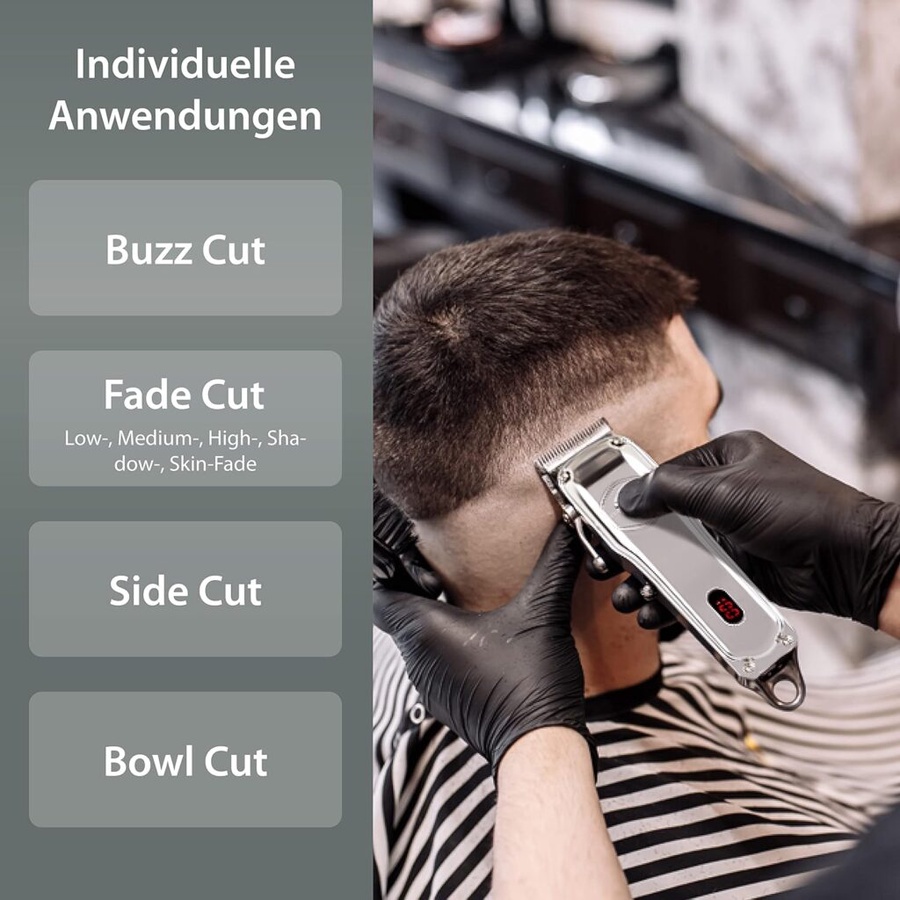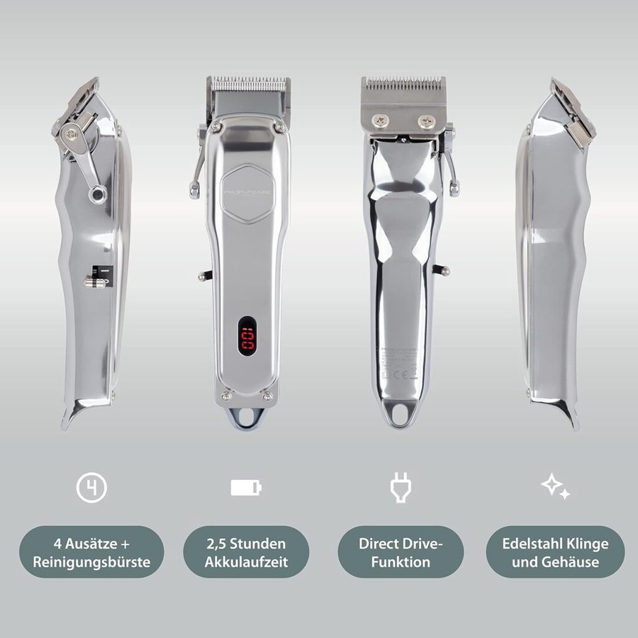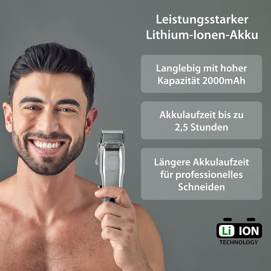 ماكينة قص شعر احترافية بشفرة ستانلس ستيل وبطارية ليثيوم-أيون (2.5 ساعة). Direct Drive، 5 أطوال قص، و 3 مراحل تخفيف. شاشة LED لمستوى البطارية.