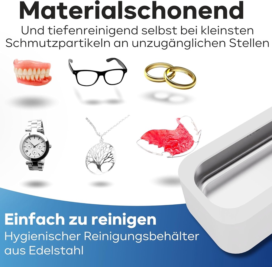 - بدون كيماويات: الميزة الأهم إنه بينظف بالميه بس، يعني مش محتاج تشتري محاليل غالية ولا تستخدم كيماويات تبوظ طلاء المجوهرات أو عدسات النظارة.