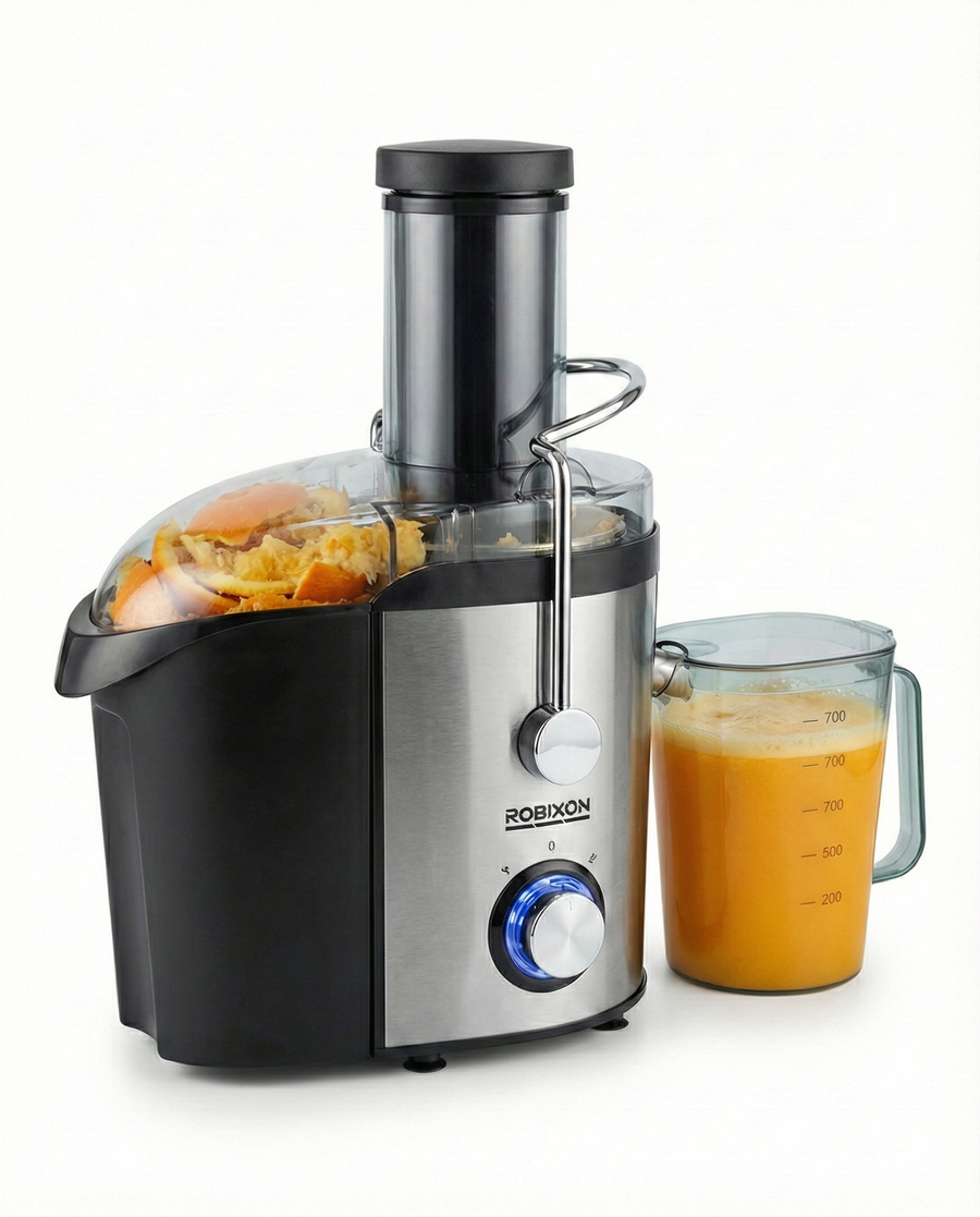 عايز تشرب عصير تفاح، جزر، أو برتقال فريش وطبيعي 100% في البيت زي محلات العصير الكبيرة؟ عصارة Robixon دي معمولة عشان تنجزك. بقوة 800 واط، الموتور بتاعها قوي جداً بيعصر الفاكهة لحد آخر نقطة ويطلعلك عصير صافي من غير قشر ولا بذر.