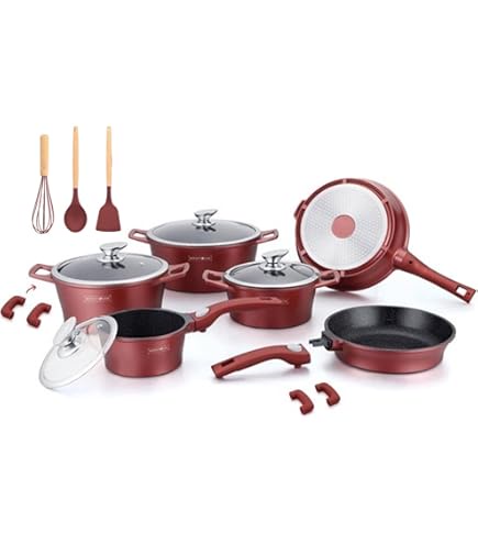 - عدد قطع كبير (17 قطعة): الطقم فيه كل المقاسات اللي ممكن تحتاجيها (حلل، مقلايات، وشواية جريل)، وكمان معاه طقم توزيع، يعني مش هتشتري حاجة تانية من بره.